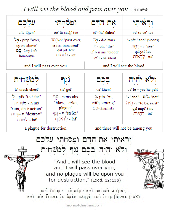 To see this note that two different words are used that can be translated as "pass over." First, God said, "I will pass over (i.e., avar: עֲבַר) the land of Egypt that night, and I will strike all the firstborn in the land of Egypt, both man and beast; and on all the gods of Egypt I will execute judgments; I am the LORD" (Exod. 12:12). But directly after saying this, God promised to "pass over" (i.e., pasach: פָּסַח) the homes of those who trusted in him to impart his protection from the plague of death: "The blood shall be a sign for you, on the houses where you are. And when I see the blood, I will pass over to you (lit. עֲלֵכֶם, 'upon you'), and no plague will befall you to destroy you, when I strike the land of Egypt" (Exod. 12:13). In other words, when God would see the blood of the Passover lamb, he would pass over to enter the house and "cover" its occupants from the judgment of death.