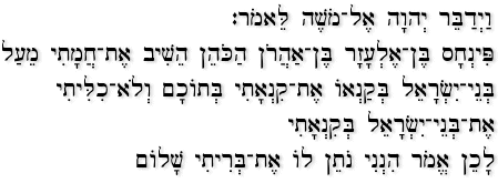 "And the LORD spake unto Moses, saying, Phinehas, the son of Eleazar, the son of Aaron the priest, hath turned my wrath away from the children of Israel, while he was zealous for my sake among them, that I consumed not the children of Israel in my jealousy. Wherefore say, Behold, I give unto him my covenant of peace" Numbers 25:10-12