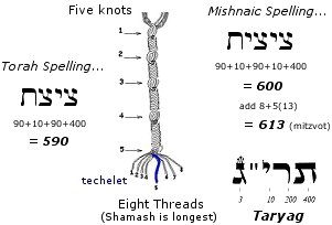(ציצת) has the numerical value of 600 (in its Mishnaic spelling - which adds another Yod to the Torah's spelling) which, when combined with the five knots of eight threads yields a total of 613, the supposed number of the commandments (taryag mitzvot) listed in the Torah as enumerated by some of the Jewish sages:
